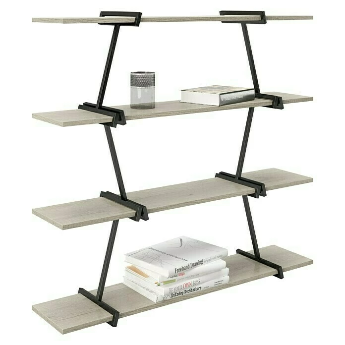 Das Regal Babylon von Phönix besteht aus vier Regalböden die Platz liefern für Bücher, Deko-Artikel und vielem mehr. Die Bretter sind mit asymmetrisch versetzten Metallstreben miteinander verbunden. Das Regal ist schlicht gehalten, hat aber durch die Maserung der Bretter und dem schwarz gefärbten Metall ein robustes Design. Es ist für alle Wohnbereiche, insbesondere für das Wohnzimmer geeignet.