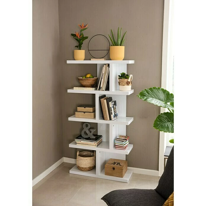 Das Regal Lloret von Phönix bietet durch seine acht asymmetrisch angeordneten Fächer viel Stauraum für Bücher, Ordner oder Deko-Elemente. Es ist in einem schlichten Weiß gehalten und hat eine Hochglanzbeschichtung. Es lässt sich daher gut mit sämtlichen Möbelstücken und Wohnaccessoires kombinieren. Das Wandregal kann für das Büro, als auch für das Wohnzimmer verwendet werden.