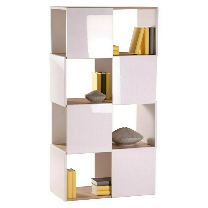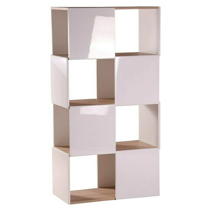 Das Regal Matrix von Phönix eignet sich um Wohnbereiche effektiv voneinander abzutrennen oder zur Nutzung als Regal. Es bietet auf vier Böden Stauraum für Bücher oder Dekoartikel. Die Fächerböden bestehen aus melaminbeschichteten Spanplatten, welche in Eiche Sägerau gehalten sind und zusammen mit der lackierten Front in weiß einen harmonischen Kontrast setzen. Die versetzte Anordnung der Fächer runden das Design ab.
