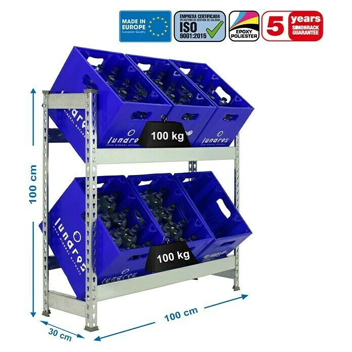 Das Getränkekistenregal Bottleclick von Simon Rack eignet sich ideal zur Einlagerung von bis zu Getränkekisten in Vorratsräumen, Werkstatt oder Garage. Das stabile Regal verfügt über mehrere Ebenen mit einer jeweiligen Traglast von 100 kg. Dank der schrägen Lagerung der Kisten ist die Flaschenentnahme jederzeit problemlos möglich. Die Montage gestaltet sich dank des Stecksystems sehr einfach.