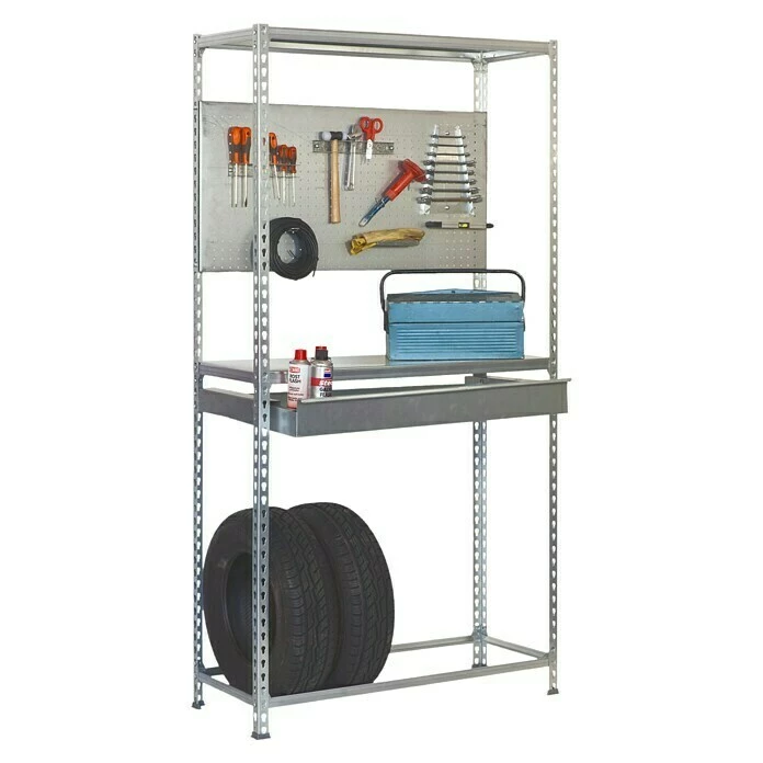 Das Reifen- und Lagerregal Mega Plus von Simon Rack ist ein Steckregal zur Einlagerung Ihrer Winter- und Sommerräder in Werkstatt und Garage. Darüber hinaus verfügt es über einen Fachboden, eine Schublade und eine Lochblech Rückwand zur Aufbewahrung von Werkzeugen. Der Aufbau ist dank des Stecksystems einfach und problemlos durchzuführen. Das Regal bietet auf einer Reifenträgerebenen, einem Regalboden und einer Schublade genügend Platz für Räder und andere Gegenstände. Die Tragkraft beträgt 200 kg pro Regalfach.