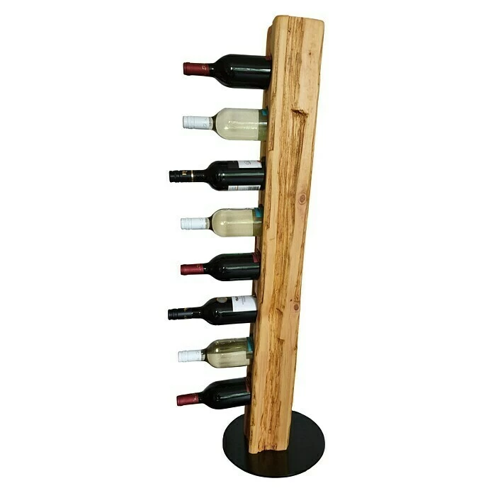 Dieser aus Massivholz in deutscher Handarbeit künstlich auf alt gestylte Weinständer, welcher sich nahtlos in jede Einrichtung einfügt, ist, aufgrund seiner ihm verliehenen Struktur, ein Unikat. Er eignet sich ideal als Geschenk für jeden Weinliebhaber oder für die perfekte Präsentation Ihres guten Weines. Die unterschiedlichen Narben, Risse und Einkerbungen verleihen dem Weinregal seine individuelle Note mit eigenem Charme und Charakter. Dieser Weinhalter weist eine Höhe von 113 cm und einen Durchmesser von 30 cm auf. Er bietet Platz für 8 Weinflaschen bei einem stabilen Stand auf einer runden, schwarz lackierten Stahlplatte. Die Flaschenhalterungen sind für Flaschen bis zu 80 mm Durchmesser (handelsübliche 0,75 l Flaschen) vorgesehen und bieten zudem mit ca. 8 cm Bohrtiefe einen stabilen Halt.