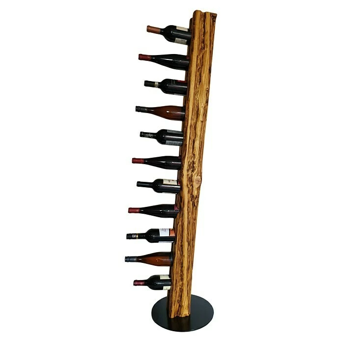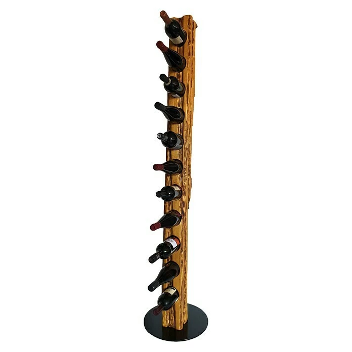 Dieser aus Massivholz in deutscher Handarbeit künstlich auf alt gestylte Weinständer, welcher sich nahtlos in jede Einrichtung einfügt, ist, aufgrund seiner ihm verliehenen Struktur, ein Unikat. Er eignet sich ideal als Geschenk für jeden Weinliebhaber oder für die perfekte Präsentation Ihres guten Weines. Die unterschiedlichen Narben, Risse und Einkerbungen verleihen dem Weinregal seine individuelle Note mit eigenem Charme und Charakter. Dieser Weinhalter weist eine Höhe von 158 cm und einen Durchmesser von 34 cm auf. Er bietet Platz für bis zu 11 Weinflaschen bei stabilem Stand auf einer runden, schwarz lackierten Stahlplatte; die Flaschenhalterungen sind für Flaschen bis zu 80 mm Durchmesser (handelsübliche 0,75 l Flaschen) vorgesehen und bieten zudem mit ca. 8 cm Bohrtiefe einen stabilen Halt.