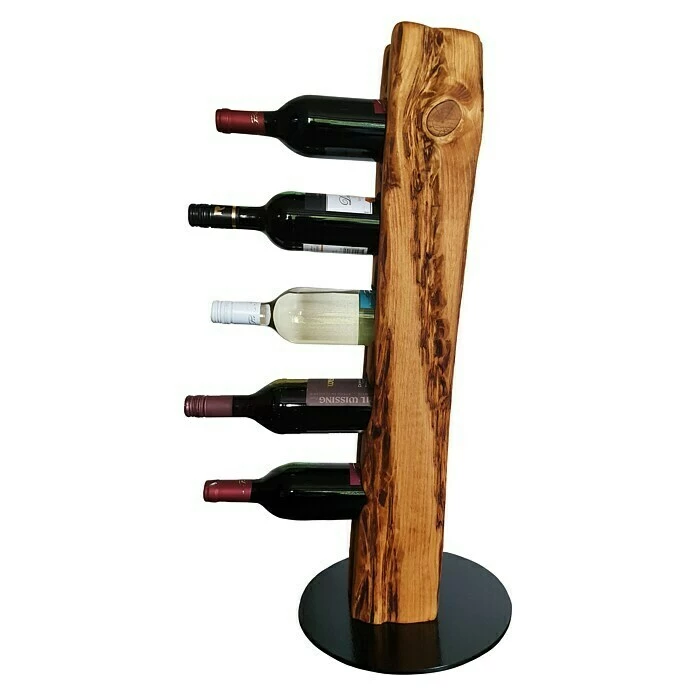 Dieser aus Massivholz in deutscher Handarbeit künstlich auf alt gestylte Weinständer, welcher sich nahtlos in jede Einrichtung einfügt, ist, aufgrund seiner ihm verliehenen Struktur, ein Unikat. Er eignet sich ideal als Geschenk für jeden Weinliebhaber oder für die perfekte Präsentation Ihres guten Weines. Die unterschiedlichen Narben, Risse und Einkerbungen verleihen dem Weinregal seine individuelle Note mit eigenem Charme und Charakter. Dieser Weinhalter weist eine Höhe von 78 cm und einen Durchmesser von 30 cm auf. Er bietet Platz für bis zu 5 Weinflaschen bei stabilem Stand auf einer runden, schwarz lackierten Stahlplatte; die Flaschenhalterungen sind für Flaschen bis zu 80 mm Durchmesser (handelsübliche 0,75 l Flaschen) vorgesehen und bieten zudem mit ca. 8 cm Bohrtiefe einen stabilen Halt.