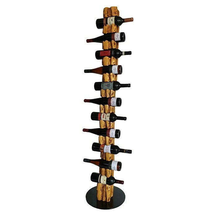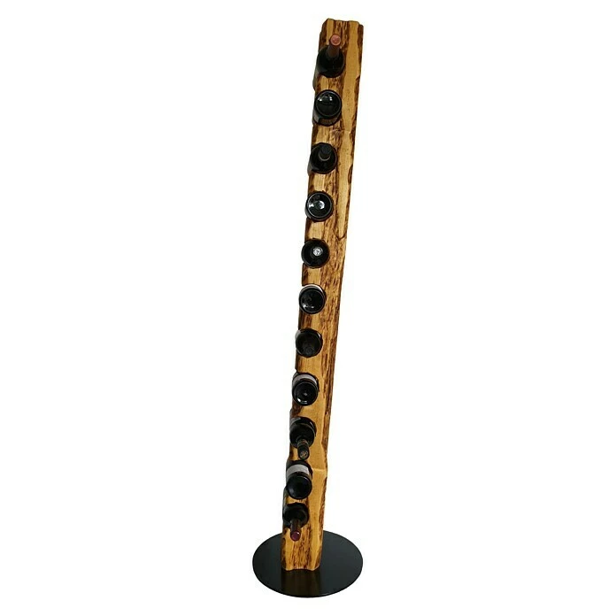 Dieser aus Massivholz in deutscher Handarbeit künstlich auf alt gestylte Weinständer, welcher sich nahtlos in jede Einrichtung einfügt, ist, aufgrund seiner ihm verliehenen Struktur, ein Unikat. Er eignet sich ideal als Geschenk für jeden Weinliebhaber oder für die perfekte Präsentation Ihres guten Weines. Die unterschiedlichen Narben, Risse und Einkerbungen verleihen dem Weinregal seine individuelle Note mit eigenem Charme und Charakter. Dieser Weinhalter weist eine Höhe von 158 cm und einen Durchmesser von 34 cm auf. Er bietet Platz für bis zu 11 Weinflaschen bei einem stabilen Stand auf einer runden, schwarz lackierten Stahlplatte. Die Flaschenhalterungen mit einem Ø von 80 mm sind speziell für handelsübliche 0,75 l Weinflaschen vorgesehen. Wir empfehlen Flaschen mit einem Ø von 68 – 80 mm zu verwenden.